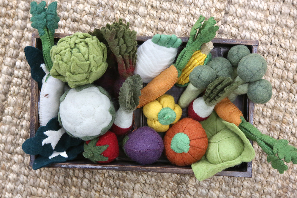 loose parts, small world characters and realistic pretend play items such as felt fruits and vegetables.