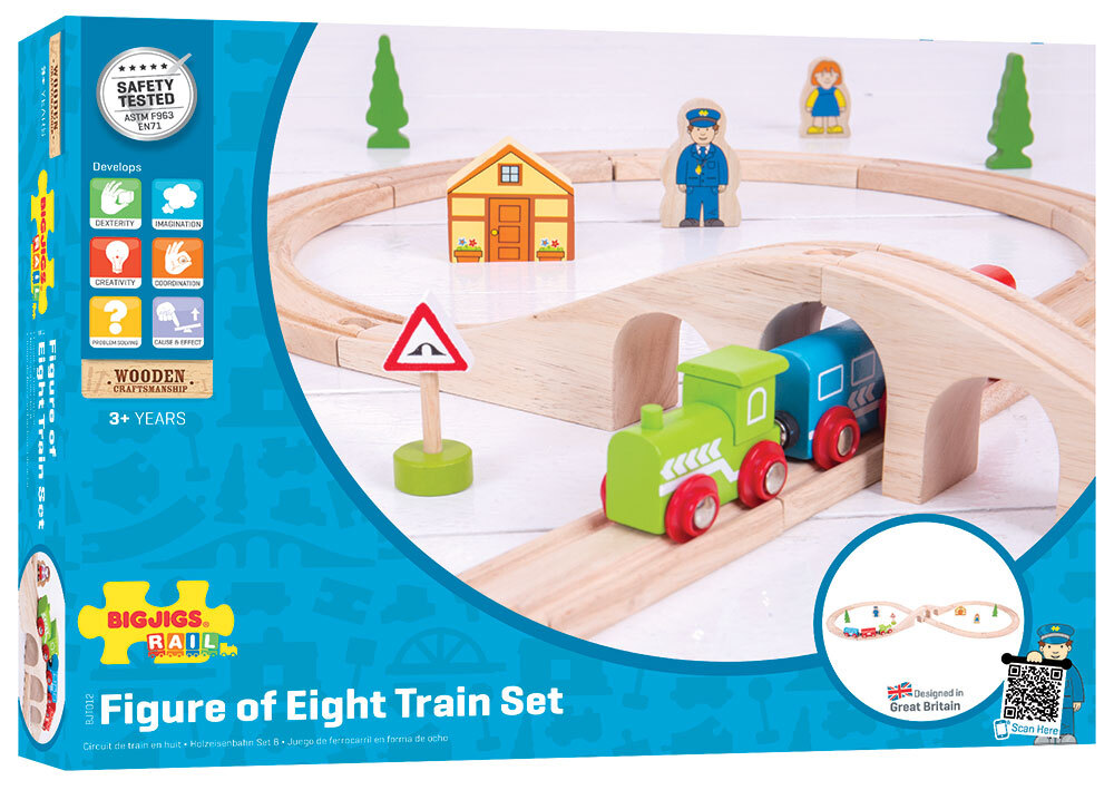 An ideal entry level train set with some variety. Includes high quality wooden track pieces that form the figure of eight layout, a colourful engine with 2 colourful carriages and a selection of accessories including people, a building and trees.