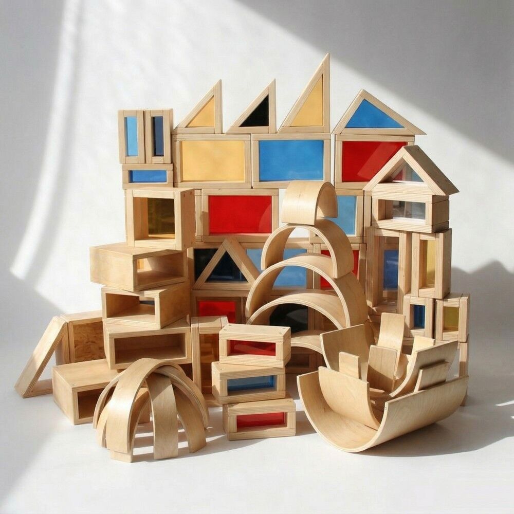 Made from durable birch plywood and acrylic, the blocks are designed for everyday use and range from 12cm to 40cm in length at varying heights. The mix of solid, transparent and reflective elements adds visual interest and sensory appeal, encouraging collaborative play, imaginative thinking and more complex construction experiences.