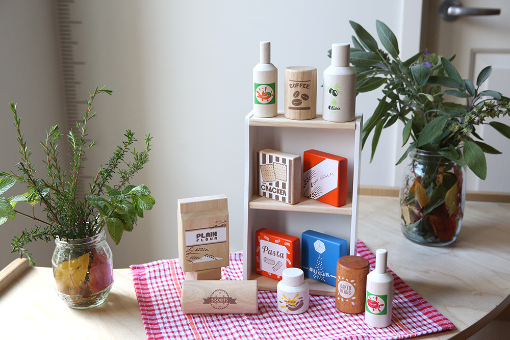 A wonderful wooden play set comprising of a display crate filled with cereal, crackers, biscuits, sugar, pasta, flour, coffee, baked beans, olive oil, orange juice and tomato sauce. Perfect addition to a role play kitchen or shop.