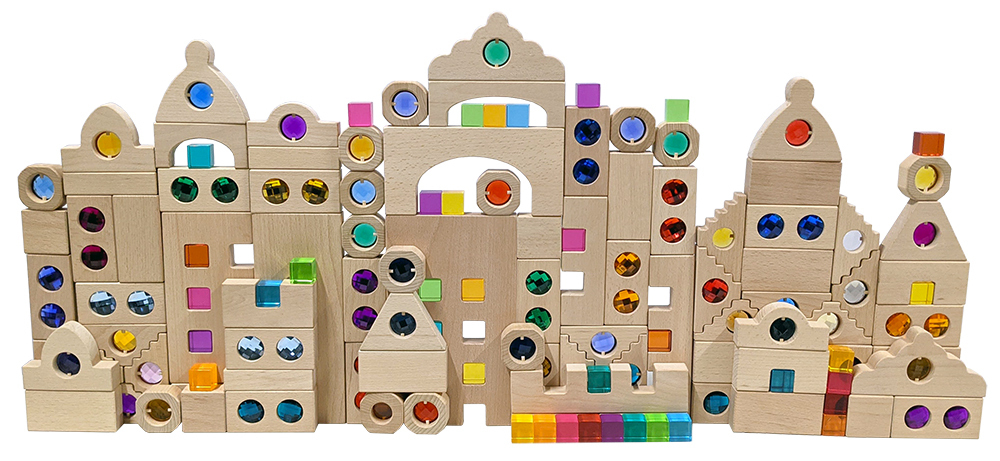 Blocks are made from sustainable Beechwood and feature jewelled acrylic pieces.