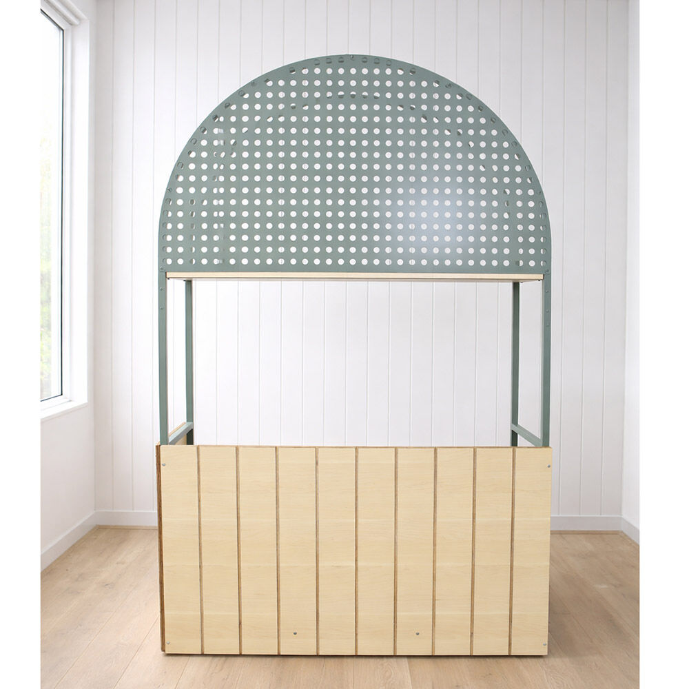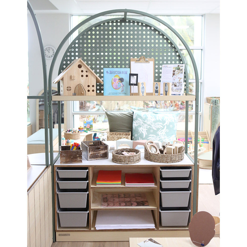 The timber surround adds warmth, texture and a more enclosed feel beneath the frame, creating an inviting nook for quiet play, reading or small group experiences. An integrated adult-height shelf also provides practical storage for teaching materials, documentation or delicate resources safely out of children's reach. Durable, stable and visually lightweight, this Perforated Feature, Shelf and Surround design complements other pieces in the Curiate range to support cohesive, organised and flexible learning environments.