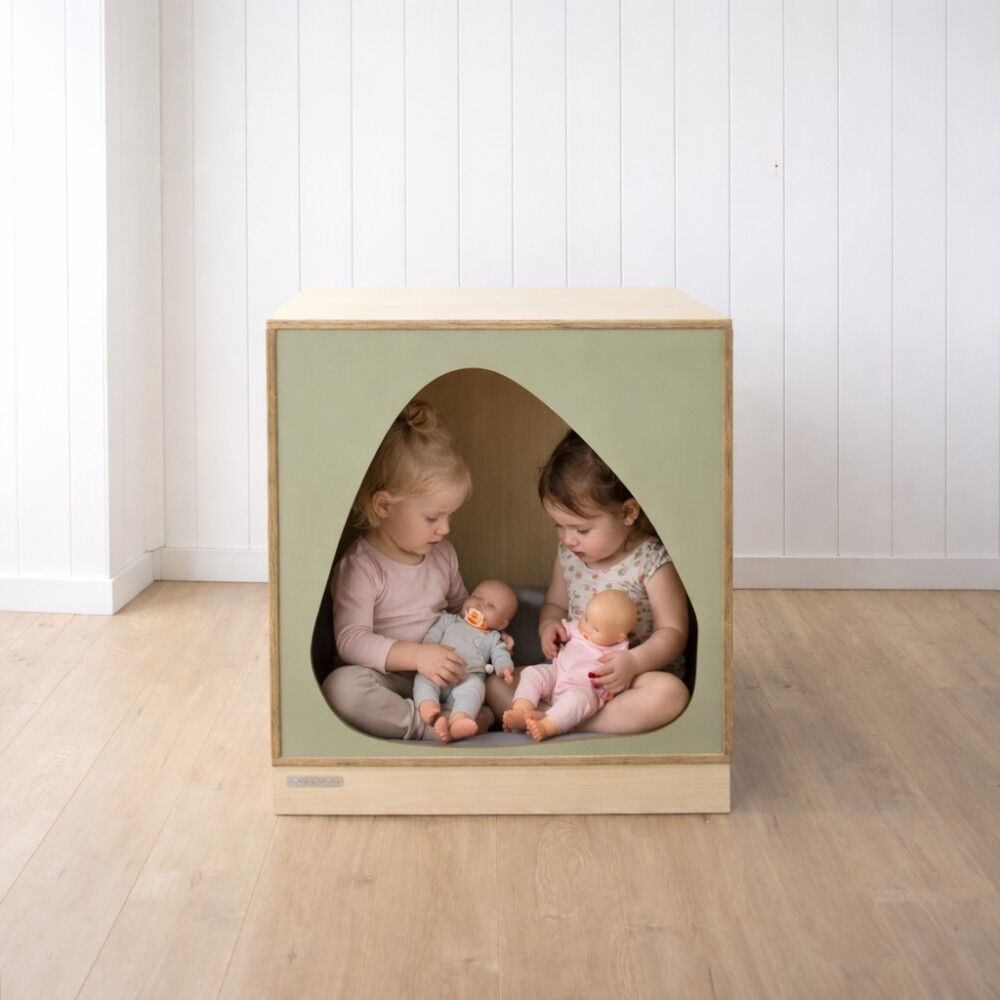 A retreat unit with an organic-shaped opening provides children with a calm, enclosed space where they can step away from the busy classroom and enjoy peaceful moments. The soft, flowing design of the entrance creates a natural and inviting feel, leading into a cosy interior that encourages relaxation, reflection, or quiet play. Perfect for supporting emotional well-being, the unit offers a safe spot for children to self-regulate or simply recharge. Its thoughtful design blends functionality with comfort, making it a valuable addition to a kindergarten environment that prioritises both learning and care.