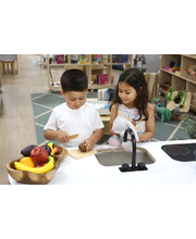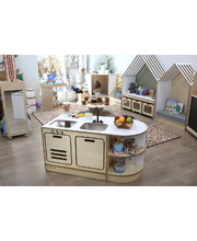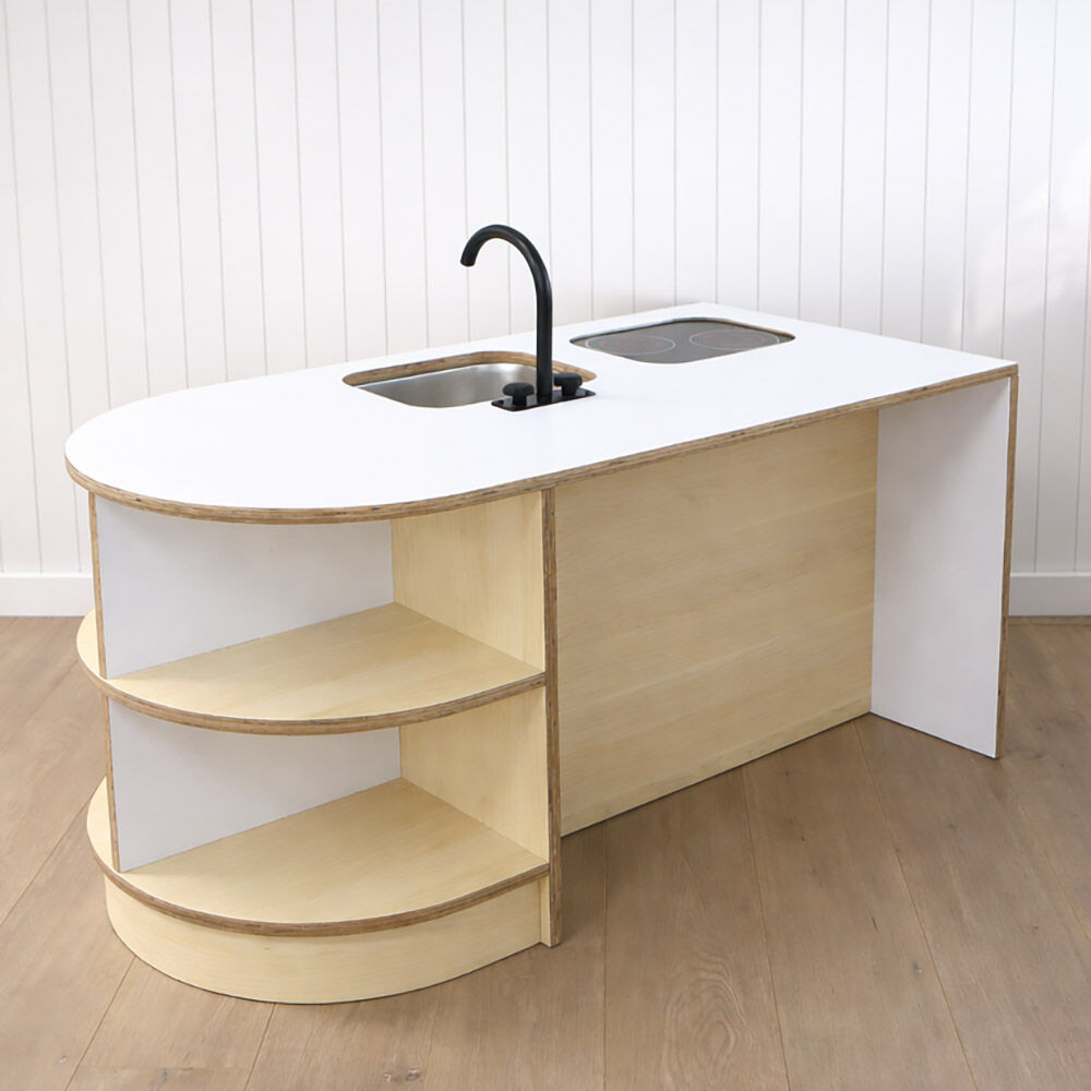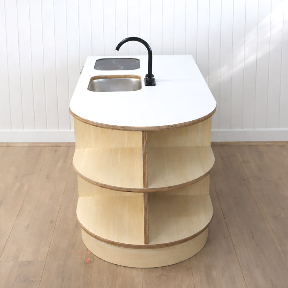 This preschool role-play kitchen is designed to inspire imaginative play, creativity, and collaboration in the kindergarten environment. Complete with a central island bench and two child-sized stools, it provides the perfect setting for social role play, encouraging children to cook, share, and interact just like at home. Open shelving offers plenty of space for storing play food and accessories, while a tap and sink add a realistic touch to the play experience. The doors feature simple cut-out handles, a thoughtful design choice that reduces the risk of loose parts or breakages during high usage. Sturdy, practical, and engaging, this kitchen set is built to withstand busy preschool play while supporting social and cognitive development.