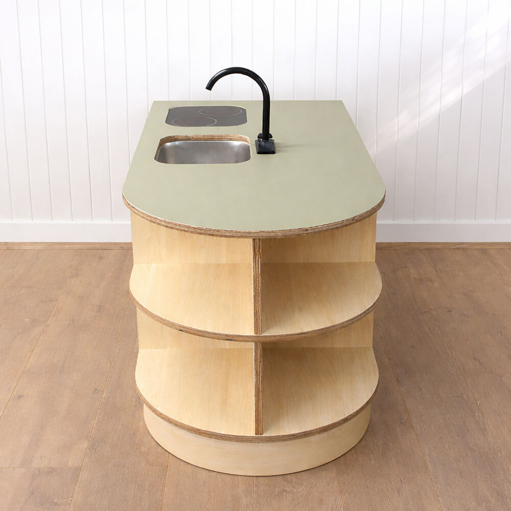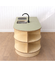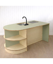 This preschool role-play kitchen is designed to inspire imaginative play, creativity, and collaboration in the kindergarten environment. Complete with a central island bench and two child-sized stools, it provides the perfect setting for social role play, encouraging children to cook, share, and interact just like at home. Open shelving offers plenty of space for storing play food and accessories, while a tap and sink add a realistic touch to the play experience. The doors feature simple cut-out handles, a thoughtful design choice that reduces the risk of loose parts or breakages during high usage. Sturdy, practical, and engaging, this kitchen set is built to withstand busy preschool play while supporting social and cognitive development.