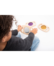 Set of 3 solid rubberwood frames with easy hold handles enclosing a panel of sparkling glitter, one in each colour - purple, silver and gold. The panels can be twisted and turned to make the glitter liquid move and flow in fascinating ways. Ideal for sensory discovery and broadening descriptive vocabulary.