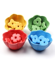 Set includes four flower bowls in blue, green, red and yellow, and 16 matching flower stones in four designs.