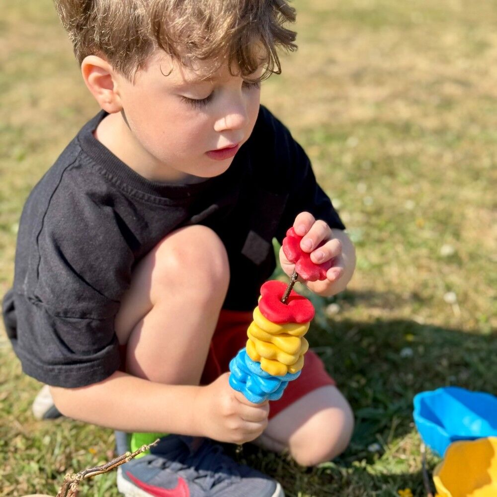 Made from a durable stone mix, the flower bowls and stones are suitable for both indoor and outdoor use, making them ideal for sand and water play, sensory setups, loose parts exploration and small world play. The bowls float and can be filled with water, flower stones or other natural materials children collect during play. The flower stones can also be threaded onto twine or sticks to encourage fine motor development and the creation of simple repeating patterns. Open-ended and highly versatile, this set supports imaginative play in mud kitchens, nature play spaces and storytelling experiences, where the bowls can become boats, nests or tiny homes for fairies and small world characters.