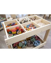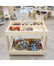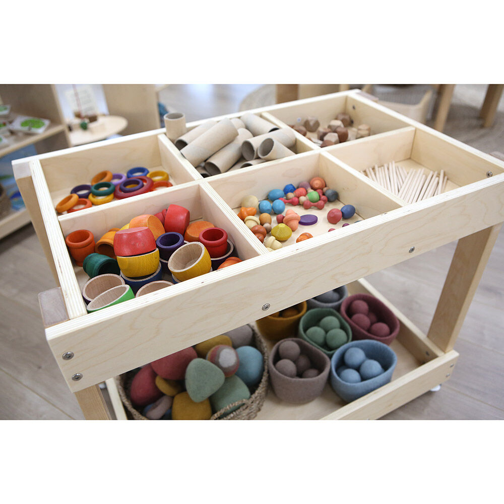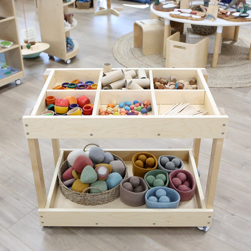 The large open compartments make it easy to store a wide range of items such as art materials, loose parts for creative play, manipulatives, or resources used during meal and activity times. The open design keeps materials visible and within reach, encouraging children to make choices and participate in everyday routines.
