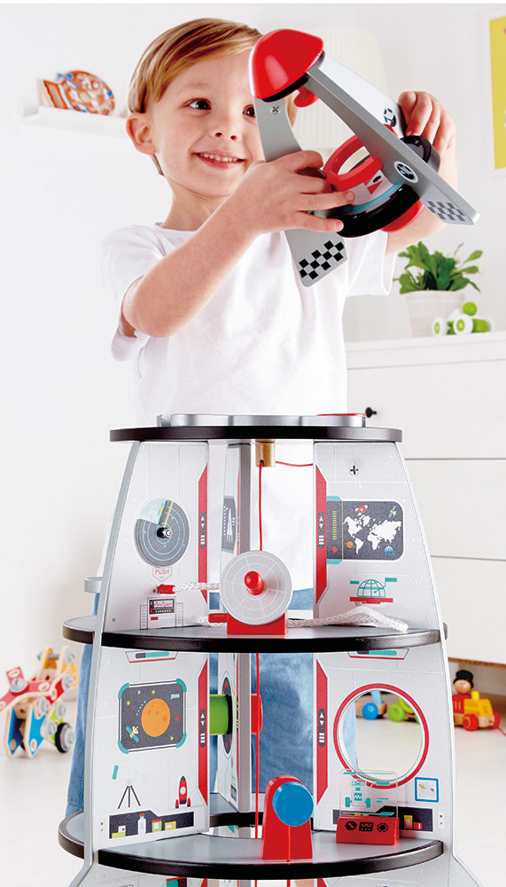 Blast off to another world with this Hape four-stage rocket ship complete with planetary lander. Conduct your very own imaginary deep-space voyage! Play with a playmate to come up with a spacefaring story. Explain what your astronauts and aliens can do in all the different levels of the rocket ship.