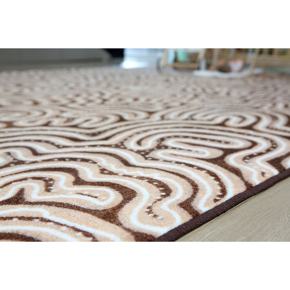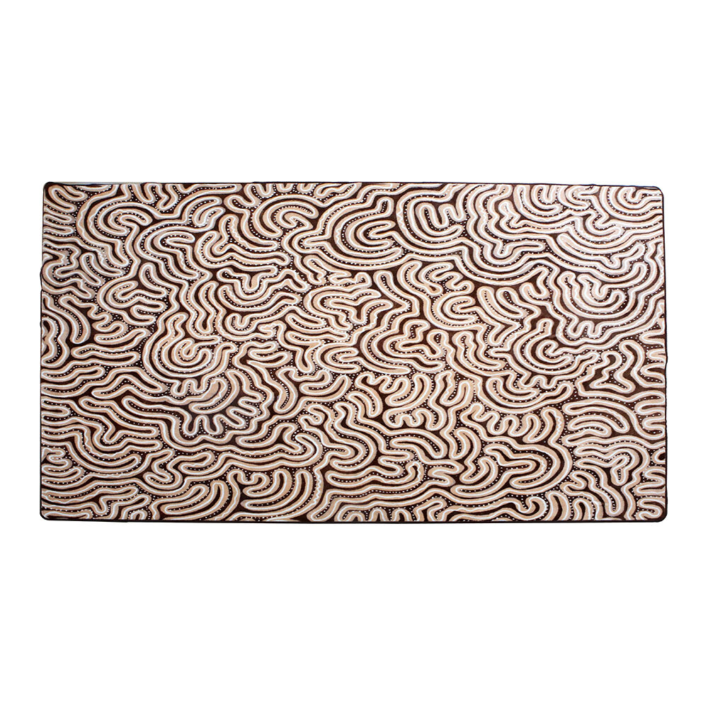 Designed by Tulli Stevens, this design, titled Barrwaya (Grow) depicts a single continuous line that gracefully winds its way across the canvas, encapsulating the essence of growth, evolution, and the journey of knowledge. Within this line, another emerges, symbolising the layers of learning and sharing that enrich our lives. As the lines intertwine and expand, they represent the interconnectedness of our experiences and the endless possibilities that unfold when we embrace the path of discovery. Serving as a powerful reminder of the importance of knowledge and the profound impact of sharing our stories and teaching with one another.