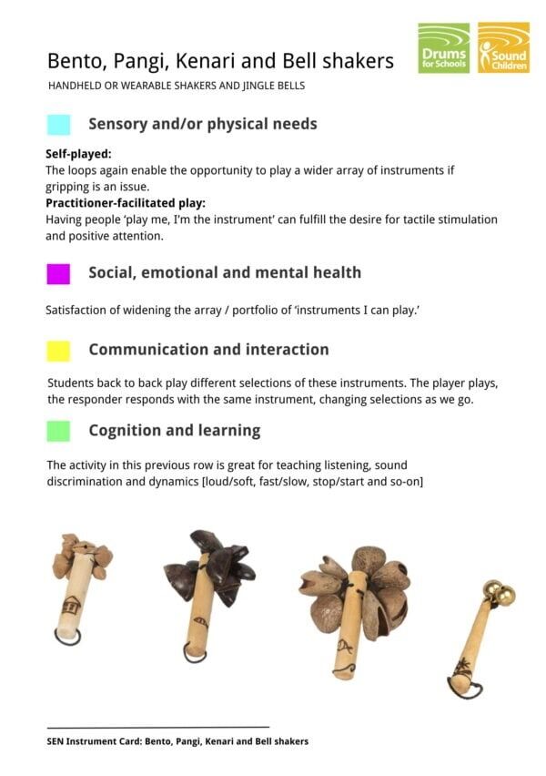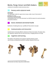 The Kenari Shaker is a beautiful, natural percussion instrument made using seed pods from the Canarium tree. Growing up to 50 metres tall in tropical regions around the world, this tree produces seeds known as chacha in parts of Africa.The Kenari Shaker produces a higher-pitched sound than Pangi or Bento shakers, offering a clear, light and tinkling tone that is ideal for sound exploration and rhythm activities with young children.