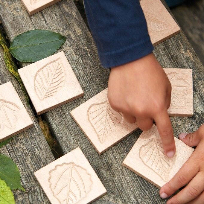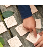 Set includes 12 wooden leaf tiles featuring 6 matching pairs: oak, birch, aspen, maple, sweet chestnut and beech.