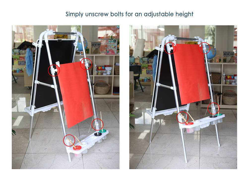 The frames are connected by adjustable clips. If these are attached to the top they create a traditional 2 sided easel. However, if you wish to expand your easel collection you simply move the adjustable clips to the sides and continue adding easel frames. After this, attaching and changing the boards is as simple as unscrewing the knobs.