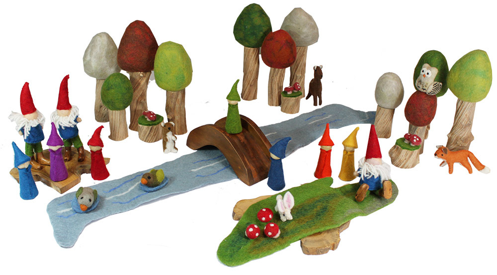 Create a magical woodland forest with this outstanding hand-made 38 piece classroom set. The set consists of: 3 x wood slices 3 x felt garden gnomes 7 x rainbow gnomes 3 x toadstool stumps 1 x wooden bridge with railing 1 x felt mossy mat 1 x felt river 5 x felt woodland animals 3 x Summer, Autumn, Winter & Spring trees 2 felt ducks. All items can be purchased individually.