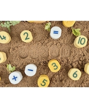 The numeral stampers include numbers 0–10, with all numerals painted green and odd and even numbers subtly differentiated by stone shade to support visual recognition. The operation symbols are painted blue for easy identification, allowing children to begin exploring early number sentences and simple calculations. Position dots on each stone help children identify the correct orientation of the numeral, supporting confidence and accuracy as they learn the number sequence and begin forming larger numbers using two digits.