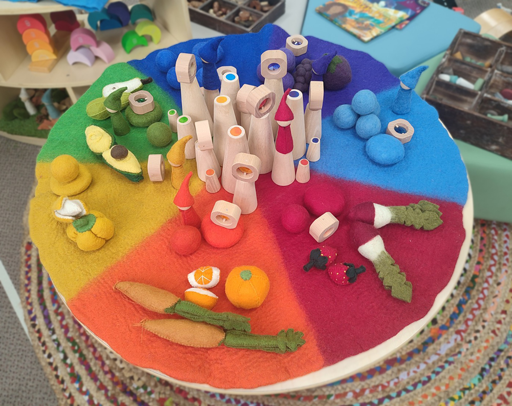 loose parts, small world characters and realistic pretend play items such as felt fruits and vegetables.