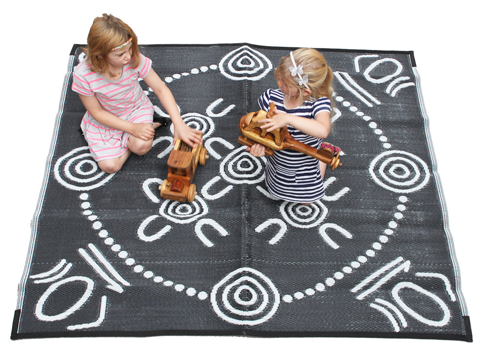 These double-sided mats are designed using Indigenous symbols, the symbols are used as a form of communication, a way to tell a story, instruction or direction. The versatility, light weight durability of the recycled polypropylene play mats are only enhanced by how easy they are to keep clean. Simply vacuum up the spills, give the mat a quick wash with soapy water, then toss over the line to dry. Great for use outdoors, however do not leave in direct sunlight or rain full time due to UV exposure. Store clean and dry. All Aboriginal Design Recycled Mats have been created by Indigenous Aboriginal or Torres Strait Islander artists under the guidelines of the Indigenous Art Code that promotes authentic, fair and ethical trade in artwork & allows for transparent processes around the production and sale of artwork.