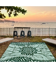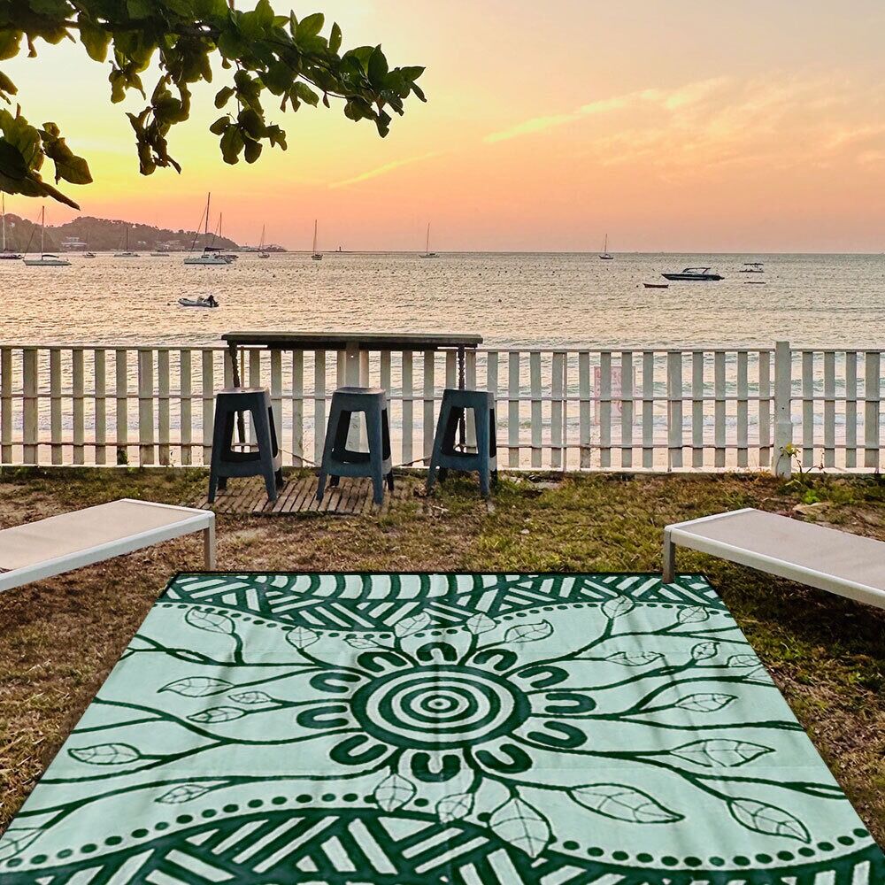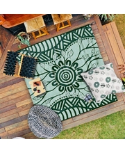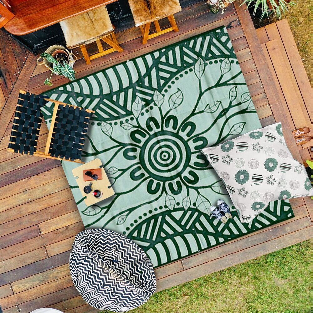 Australian Aboriginal artist De Greer Yindimincarlie, of the Wiradjuri Nation in central New South Wales, designed this recycled, reversible green-hued Yarning Mat. De Greer Yindimincarlie elaborates about her inspiration behind the 'Growth' Mat, a testament to personal growth and resilience. "Every day we learn and experience new things, this is all part of our growth as a person. Growth is important; it needs to happen because to stop growing is to stop living."