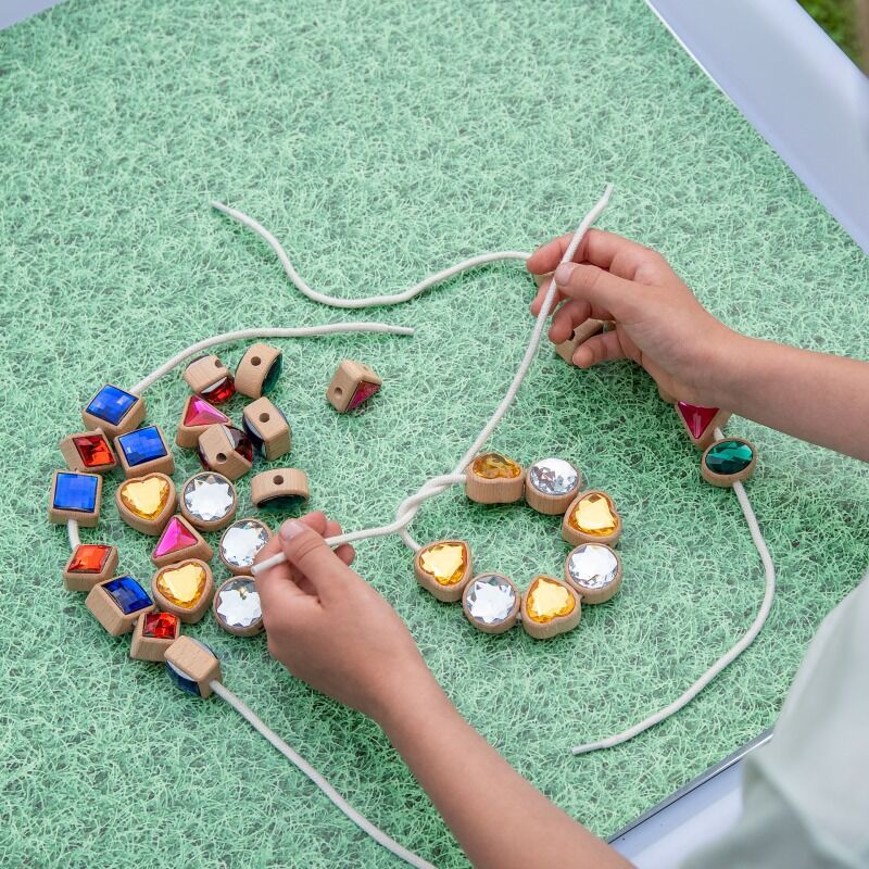 Bring a sparkle to playtime with our stunning Shape Lacing Jewels. Designed to engage little hands and growing minds, this beautiful set combines the fascination of colourful jewels with the smooth sensory feel of wood and the creativity of threading and sorting activities.