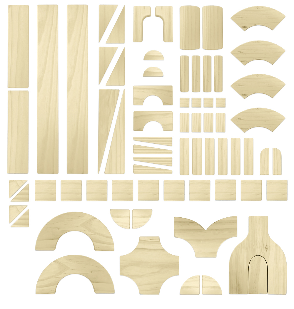 Each unit block is sanded smooth with round edges, has a depth of 3.3cm, a common width of 6.6cm and are based on halves, doubles and quadruple measurements to lay the foundations for basic maths, geometry and engineering. The 70 piece Alternative Shape set contains 30 different shapes, ranging from the Quarter Pillar 3.3 x 3.3 x 3.3cm (L x W x D) to the largest Double Board 52.8 x 6.6 x 1.65cm (L x W x D)