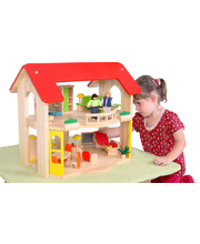 This brightly coloured doll house has a removable roof panel to provide easy access whilst playing. It includes a bedroom, bathroom, living room, dining room and kitchen.
