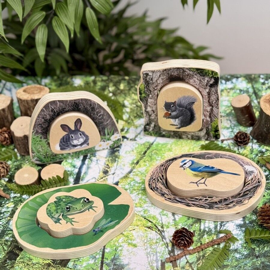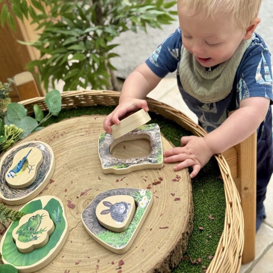 Discover who is hiding in the woods with this beautifully illustrated set of four double-sided FSC wooden puzzles, designed to support hands-on learning and imaginative play in early learning environments. Each 2-piece puzzle includes a chunky raised animal piece and matching habitat base, making it easy for small hands to grasp, place and explore. Children can complete the habitat scene on one side, then flip the inner piece to reveal the hidden woodland animal inside, adding an extra element of surprise and discovery.